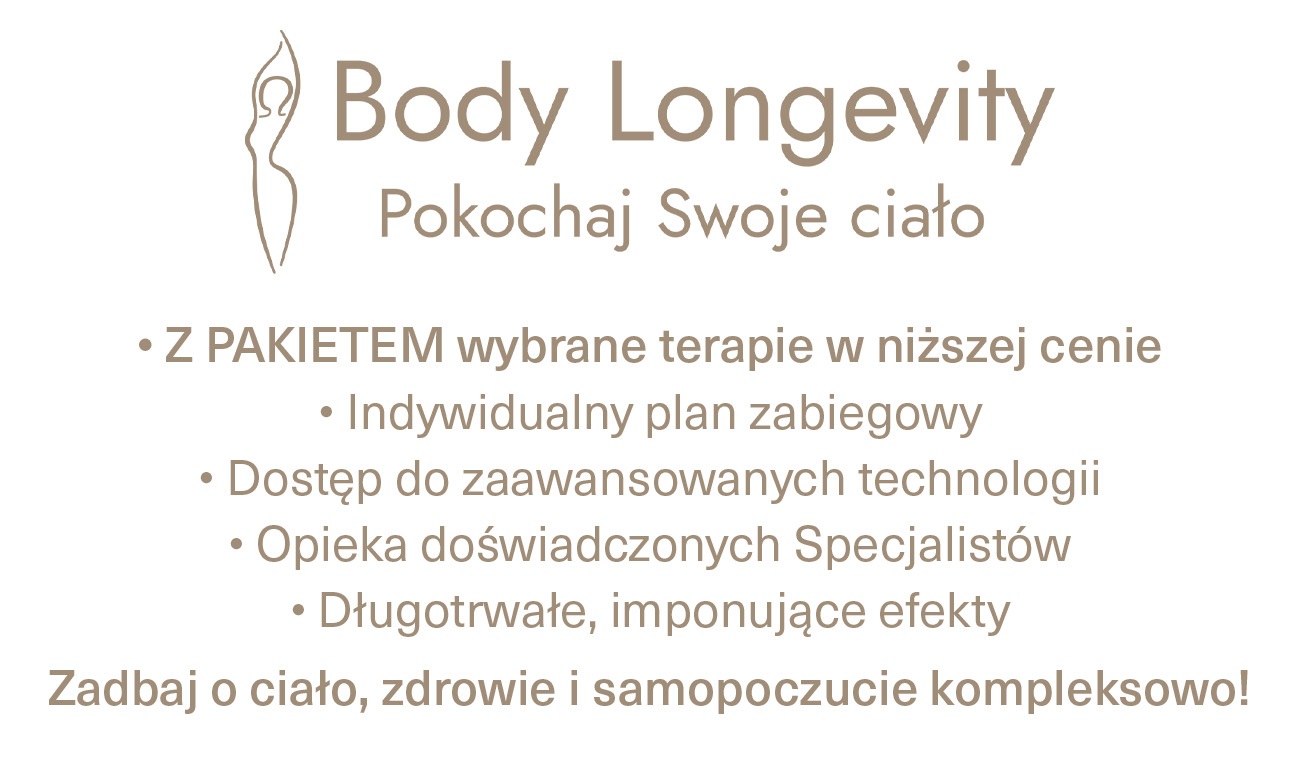 *Aby skorzystać z Body Longevity, należy dodać do koszyka jeden z ww. Pakietów. Po dodaniu Pakietu ceny pozostałych terapii biorących udział w Body Longevity zostaną automatycznie zmniejszone w Koszyku. Terapie biorące udział w Body Longevity oznaczone są w cenniku jako "1 zabieg z Pakietem Body Longevity" – Pacjent może zakupić ich dowolną liczbę. Pakiety obowiązują od 2.03.2026 do 31.05.2026.